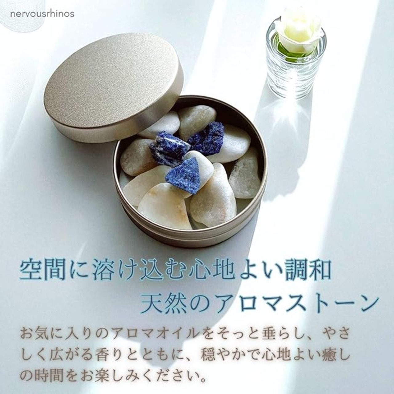 商品到着時天然石は乾燥して白くなっていますがアロマをたらせば光沢がでてキレイな天然石の表情をお楽しみになれます。乾燥した石が白い粉をふく理由は、石に含まれるミネラルが水に溶け、乾燥する際に水が蒸発してミネラルが再結晶化し、白い粉状の物質として表面に現れるためです。