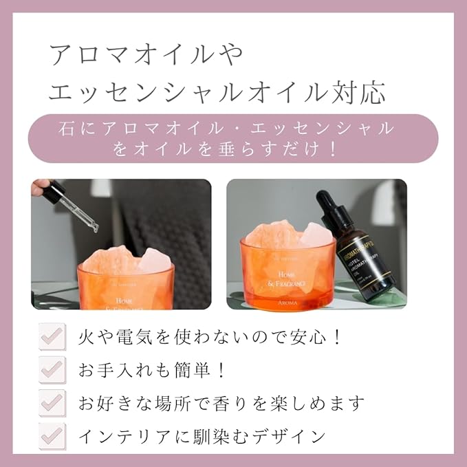 アロマオイルやエッセンシャルオイル対応:石にアロマオイル・エッセンシャルオイルを垂らしてご利用いただくので火や電気を使わなく(台座を除く)、安全に使用いただけます。