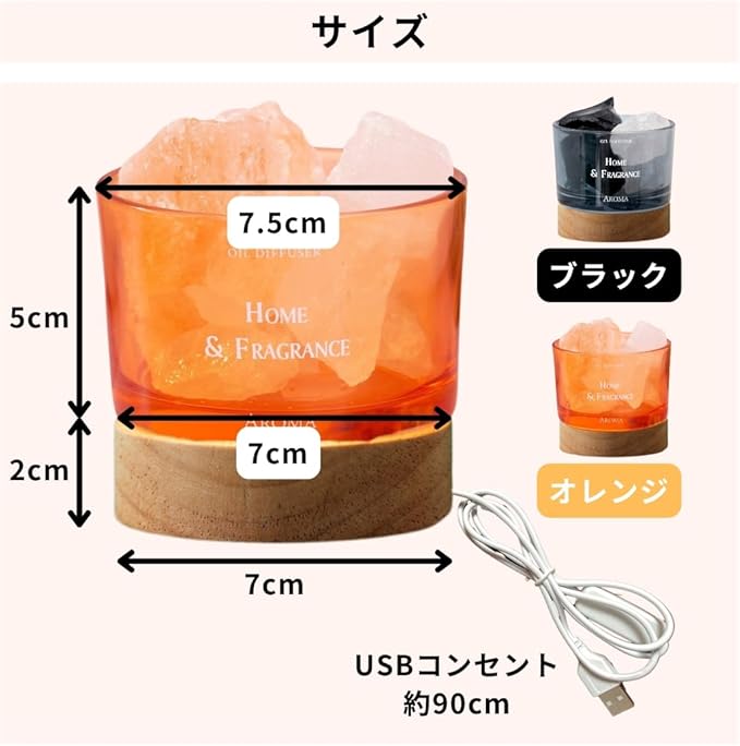 《サイズ》ガラス容器:直径7.5cm*高さ5cm 光る台座:直径7cm*高さ2cm(USBコンセントの長さ 約90cm)《カラー》ブラック / オレンジ ※オイルは付属しておりません