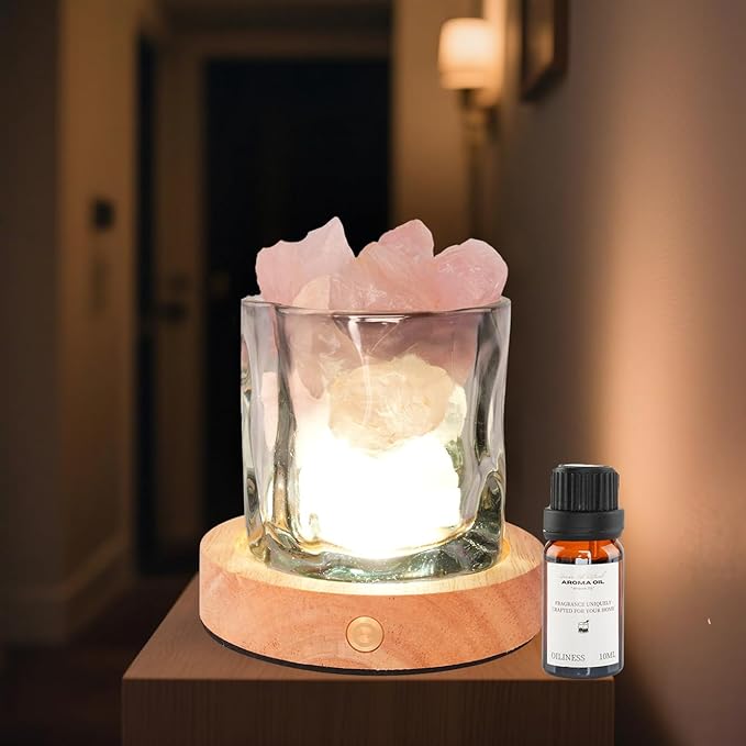 【オールインワン癒しセット】 スモーキーグレーのらせん模様ガラスカップ+木製充電ベース+天然精油10ml+ピンク水晶330g+三国語(日/英/中)説明書が上質ギフトボックスに。きらめく質感のカップと香りの調和が、視覚と嗅覚のデュアル癒しを約束。