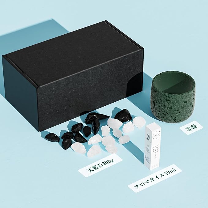 【セット内容】 天然石(白水晶+黒曜石、約300g)/ アロマオイル 1本(約10ml)/ クレーター模様の容器(約Φ8 H8cm)