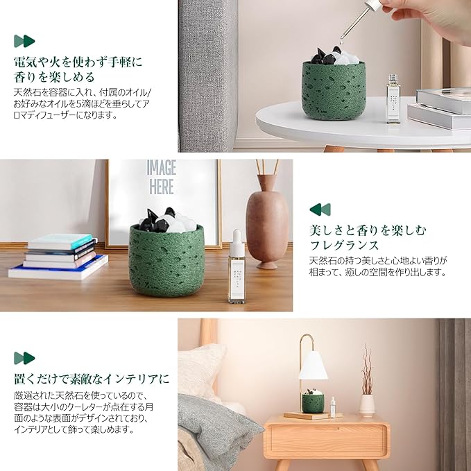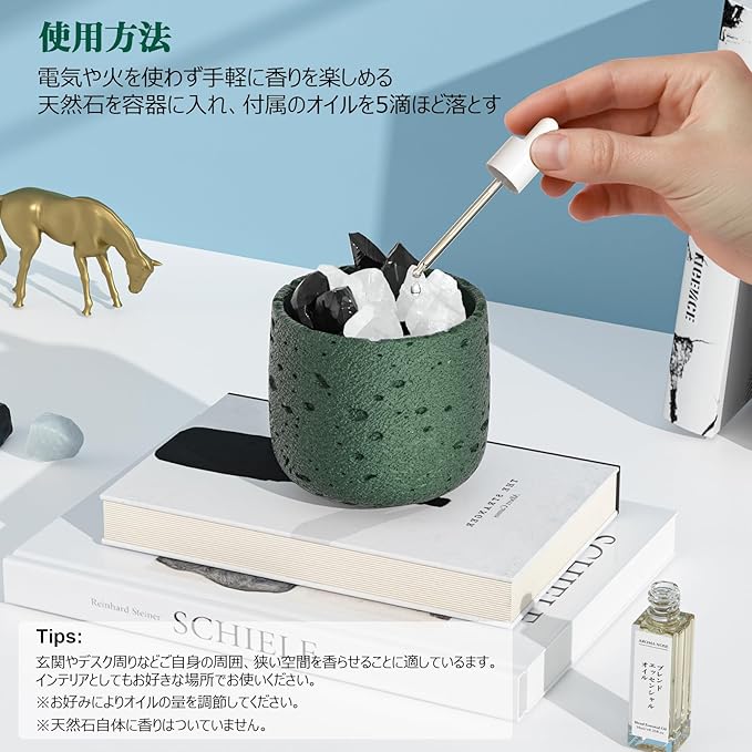 【簡単な使用方法】電気や火を使わず手軽に香りを楽しめます。天然石を容器に入れ、付属のオイルまたはお好みなオイルを5滴ほど落として、簡単に香りを楽しめます。