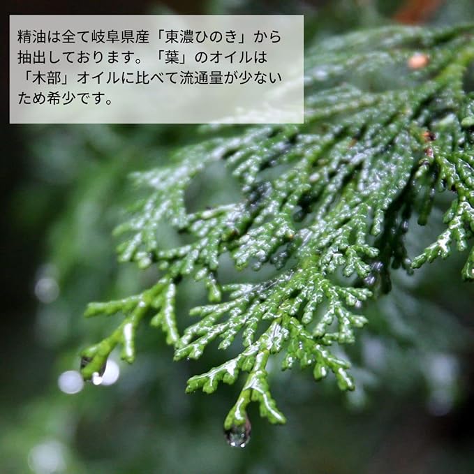 一般的に流通しているひのきオイルは「木部」から抽出したものが多いですが、本品はひのきの「葉部」から抽出した「ひのき葉オイル」となります。 葉部は木部と比較し抽出コストがかかるため高価となりますが、木部のような苦みが無く、甘みを含んだ上質な香りがします。