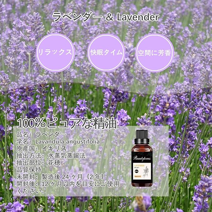 成分:天然純度100%のラベンダー精油です。香りは、空気、空間、使用する容器、使用者の香りへの感受性と好み、また体調の影響を受けて、異なる状況で微細な香りの違いが生じる可能性があります。使用時の空気やご自身の感性に注意しながら、香りの変化を感じながら、実際の状況に応じて使用量を増減させ、楽しいひとときをお過ごしください。