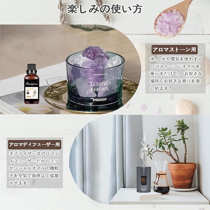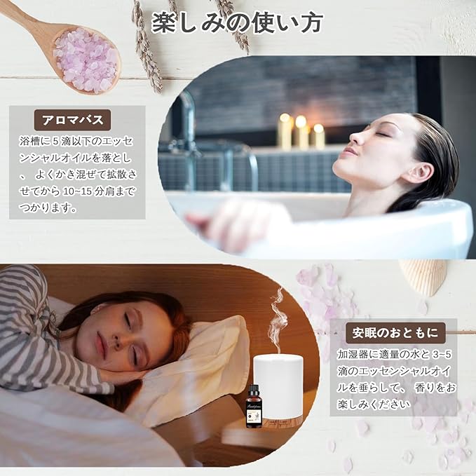 使用方法: 卓上、玄関、トイレなどの狭いスペースでは、アロマストーン/アロマランプ/アロマポットなどに垂らして使用できます。一方、リビングルームなどの広い部屋では、アロマディフューザー/加湿器を使って香りを楽しむことができます。