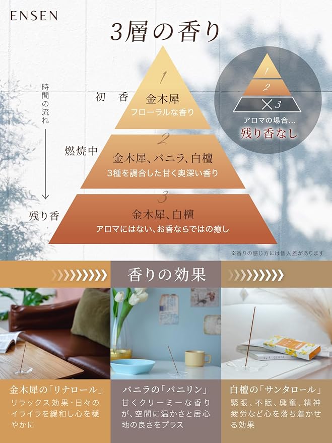 ✅【 ENSENのお香の魅力 】キンモクセイの香りに合う最高級のインド産老山白檀など様々な成分をブレンドしています。花と香木、それぞれの個性を引き出しつつ、全体の調和を保つように配合しています。シーンで変化する「 奥行きのある金木犀の香り」があなたを心地よい空間へと誘います。