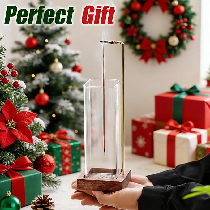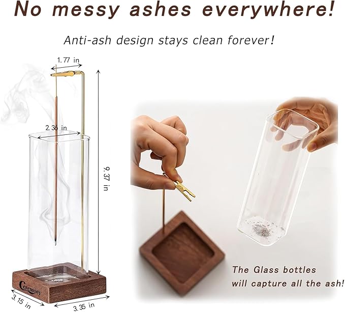 【灰が散らばらない】このお香立ては、通常のものよりも高いガラスカップが付属しており、お香が最後まで燃焼しても灰が外に落ちることはありません。より快適で安心した香道体験を提供します。溜まった灰はゴミ箱に捨てるだけ。透明ガラス製だからお香の燃焼経過を存分に愉しむことができます。さらにお香に手や周囲物が直接触れないため安全です。