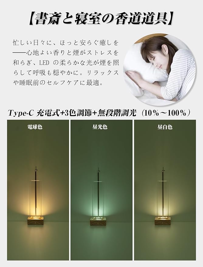 【無段階調光と長時間連続使用】お香立てのベースには、無音タッチスイッチが付いており、短いタッチで光の色温度を選択し、長押しで明るさを無段階調整できます。最低明るさ設定で充電後、最長72時間連続発光できます。気分や環境に合わせて、適切な光や明るさを選んで雰囲気を演出できます。