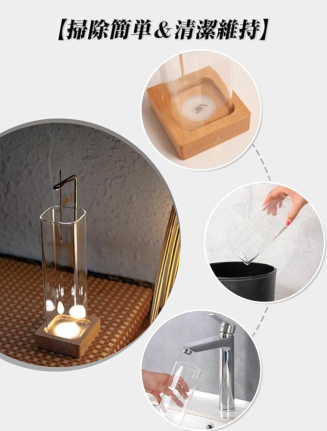 【灰が散らばらない】このお香立ては、通常のものよりも高いガラスカップが付属しており、お香が最後まで燃焼しても灰が外に落ちることはありません。より快適で安心した香道体験を提供します。
