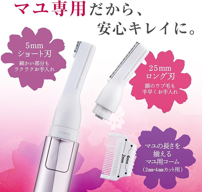 【ショートとロング2種類の刃】 25mmのロング刃はコームをつけて長さを整えたり、コームをはずしてマユ周りのうぶ毛のお手入れに便利。5mmのショート刃は細かい部分のお手入れに最適。