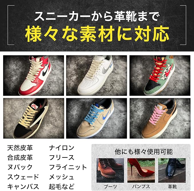 【様々な靴に対応】スニーカー・革靴・ブーツ・パンプスなどの様々な靴や、天然皮革・合成皮革・レザー・スエード・ヌバック・キャンバス・ナイロン・フリース・フライニット・メッシュ・起毛など複数素材に対応可能です。
