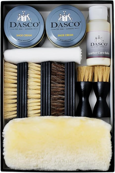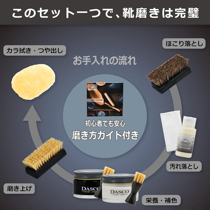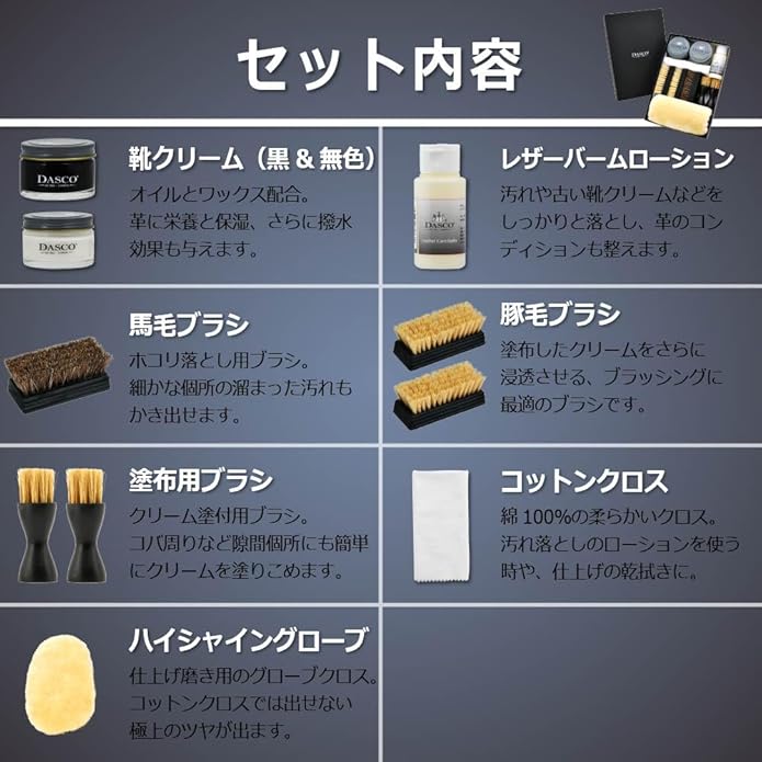[Dasco] [ダスコ] 英国伝統の品質 靴磨きセット スペシャルグローブ セット ダブル(PA-DSZG) 革靴 手入れ セット メンテナンス 靴クリーム 馬毛 豚毛 ブラシ クロス 初心者 高級 黒 無色 着色 補色 キズ隠し