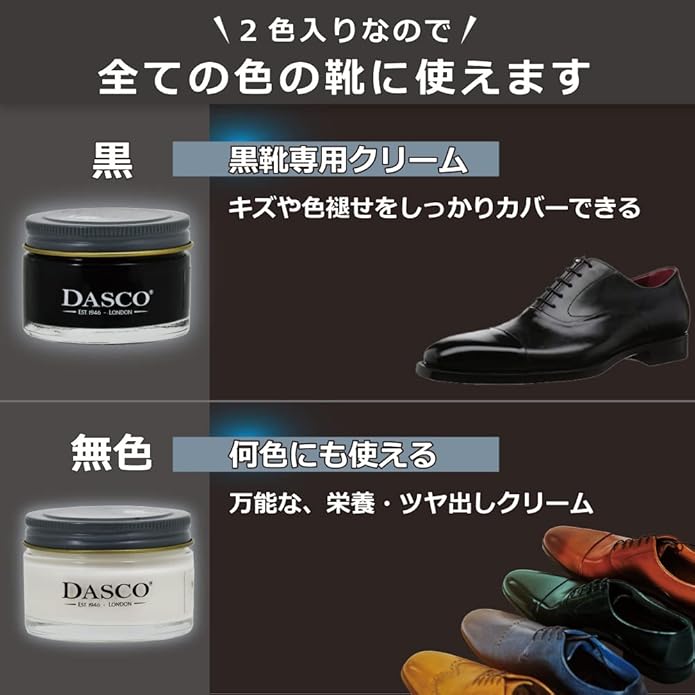 靴クリームとポリッシュの色は基本の黒と、何色の靴にも使える無色の2色入りで、全ての色の靴に使用が可能です。