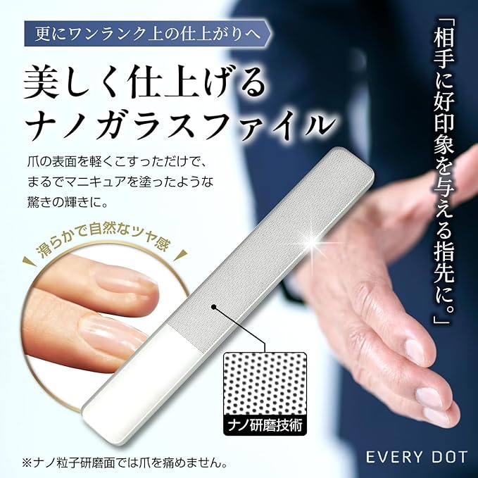 最後に、EVERYDOT製の爪切りに付属の爪やすりは高級 ナノガラス使用で、収納ケース付きなので、清潔感と好感度を求める男性にとって最適なネイルケアツールです。その高品質と機能性は、日常の爪ケアを格段に向上させます。