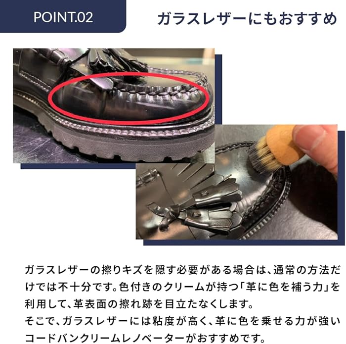 ・特殊なカラーワックス配合によりコードヴァンの色を鮮やかに蘇らせて補色します。・保革(栄養)効果や美しい光沢感を出すことでコードヴァンが本来放つツヤをしっかりと出します。着色力が強く革に色がうまく乗るので、ガラスレザー等の通常の乳化性クリームが浸透しにくい革の補色にもお使い頂けます。■用途:コードヴァン(コードバン)の補色・栄養・ツヤ出し、ガラスレザーの補色・ツヤ出し■タイプ:乳化性クリーム ガラスビン入り■容量:60ml ■原産国:イタリア製 ■カラー:全7色(ブラック・ニュートラル・Mブラウン・Dブラウン・Lブラウン・ネイビー・バーガンディ)■注意:用途以外の製品には使用できません。必ず目立たない部分でテストしてからご使用下さい。