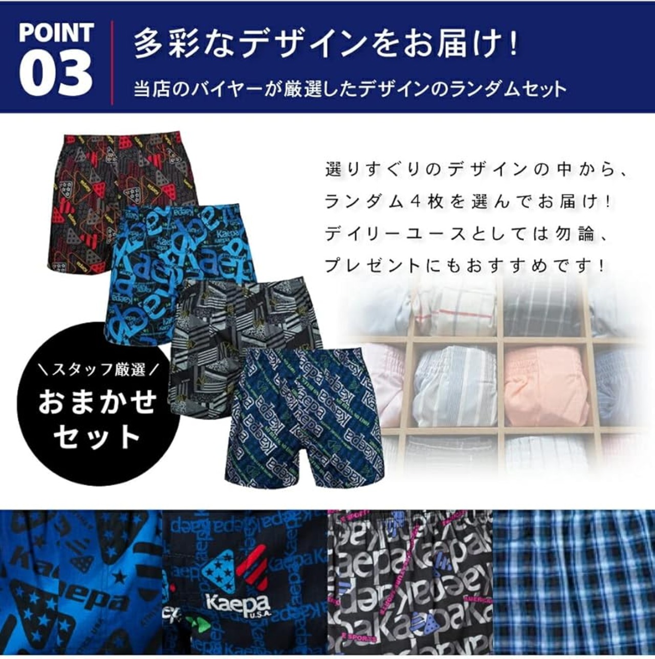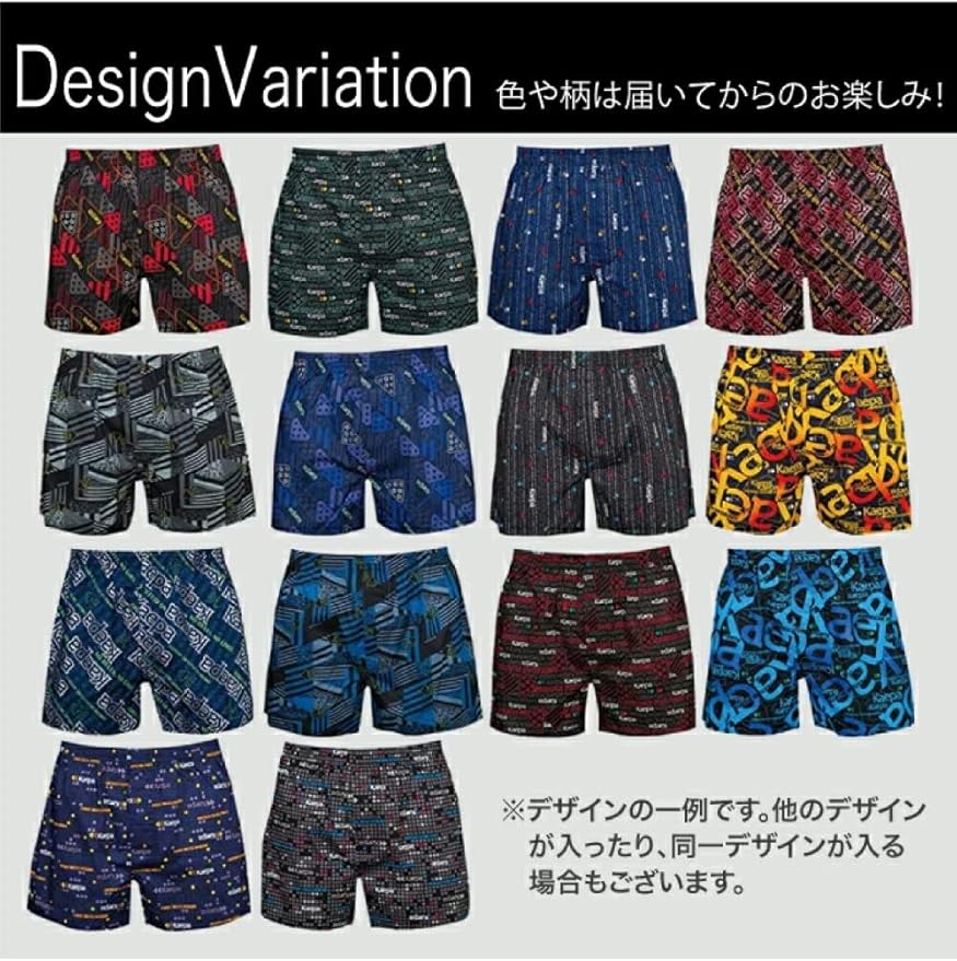 [デザイン] Kaepaのトランクスは、アメリカンスポーツのスピリットを反映したデザインで、カラーバリエーションも豊富にご用意しています。 レッド、ブラック、ブルー、パープル、グレーなど、様々な色をお楽しみいただけます。 履き心地に妥協はなく、太めのゴムウエストバンドが体にフィットしながらも締め付け感を排除し、ゆったりしたシルエットで動きやすさを実現します。 色や柄はアソートでおまかせになります。 商品画像は参考であり、実際の商品と異なる場合があることをご了承ください。
