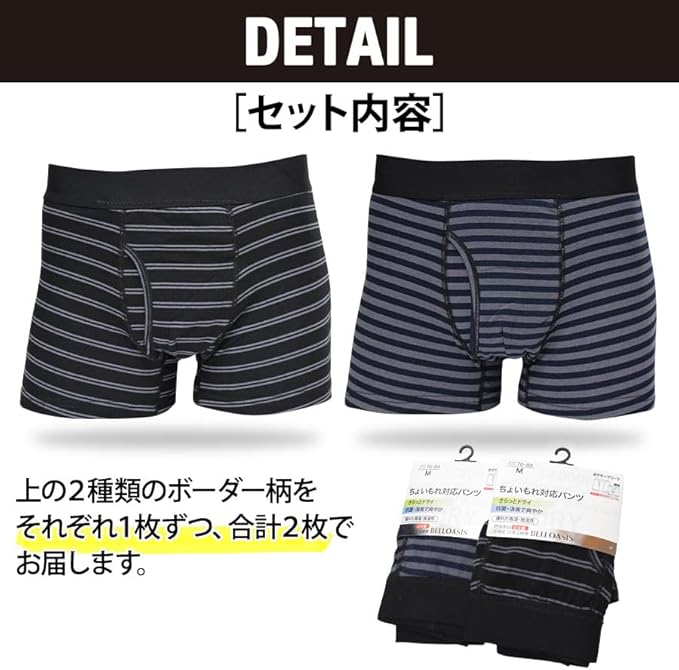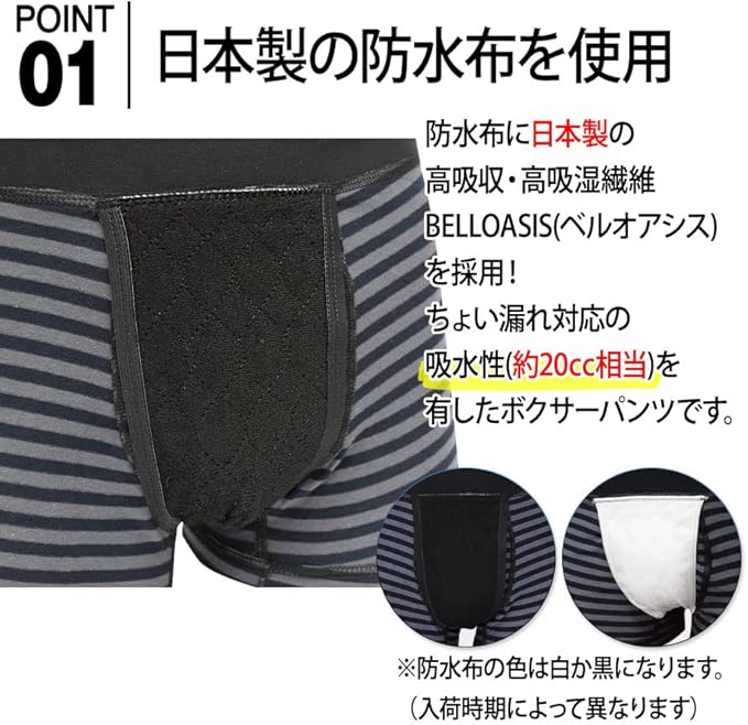 防水布に日本製の高吸収・高吸湿繊維BELLOASIS(ベルオアシス)を採用!ちょい漏れ対応の吸水性(約30cc相当)を有したボクサーパンツ2枚組です。