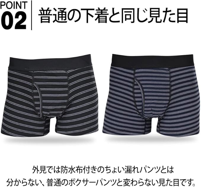 通常のボクサーパンツと変わらない見た目なので、人目を気にせずお履き頂けます。