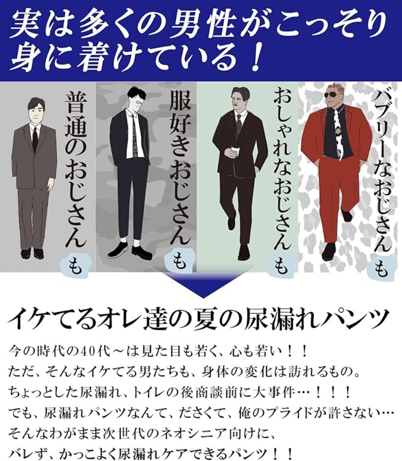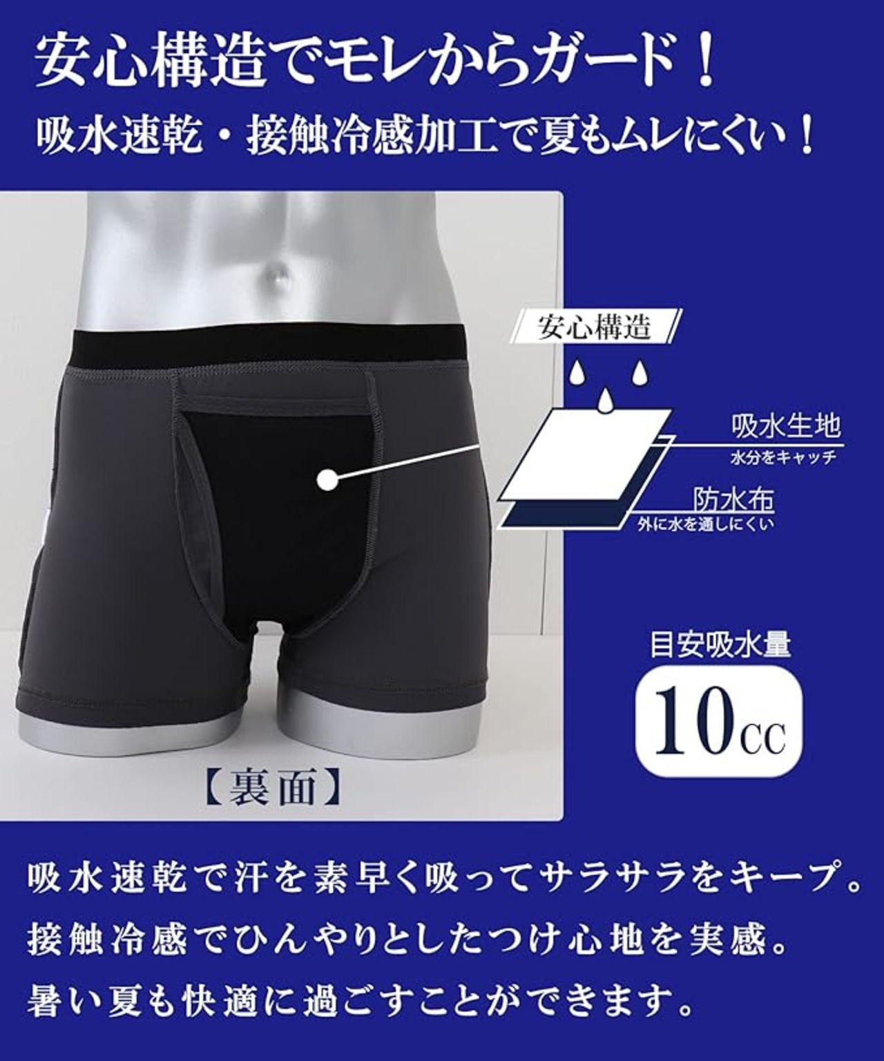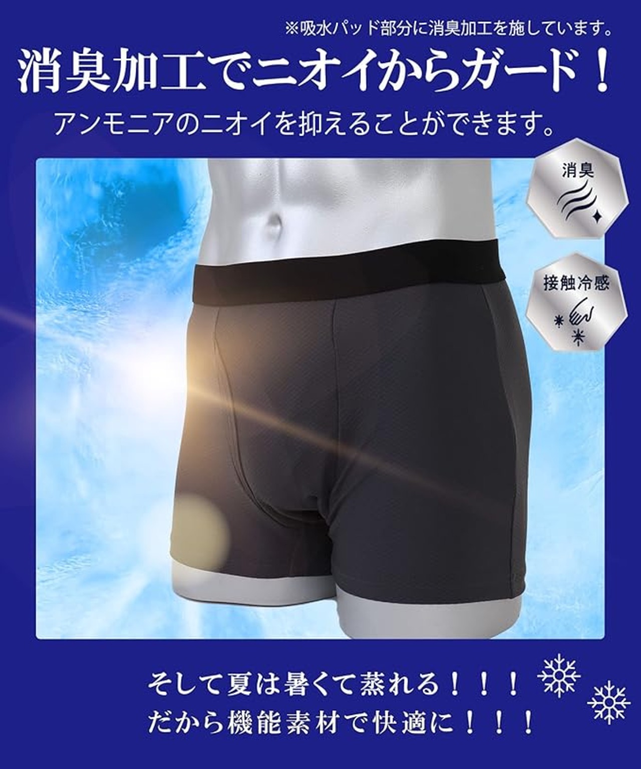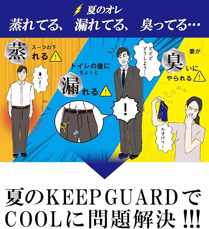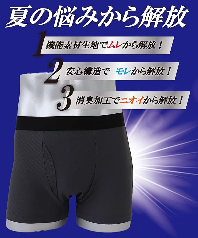 夏の悩みから解放:①機能素材生地でムレから解放 ②安心構造でモレから解放 ③消臭加工でニオイから解放