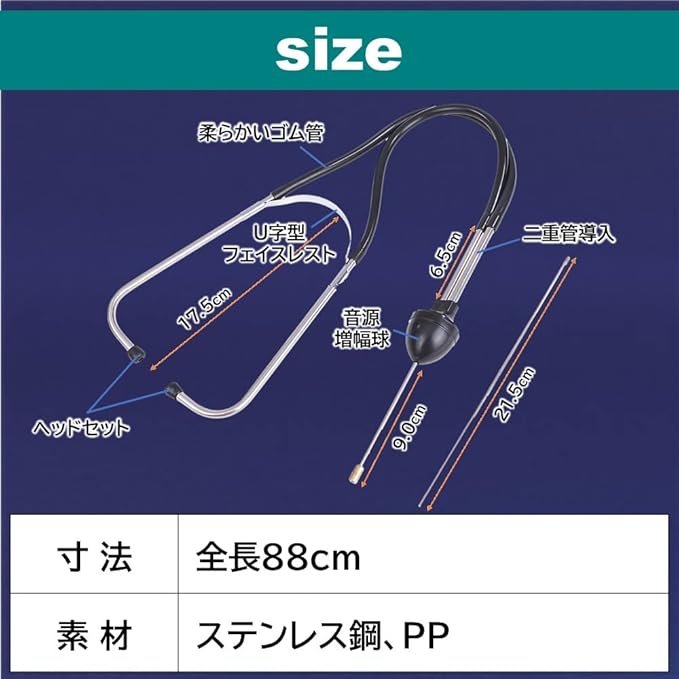 ベアリング/チェーン/テンショナ/タペットなどの異音を聞く時にもお使いいただけます。ステンレス鋼素材で錆びや腐食に強く、耐久性があるので、長期間ご使用いただけます。