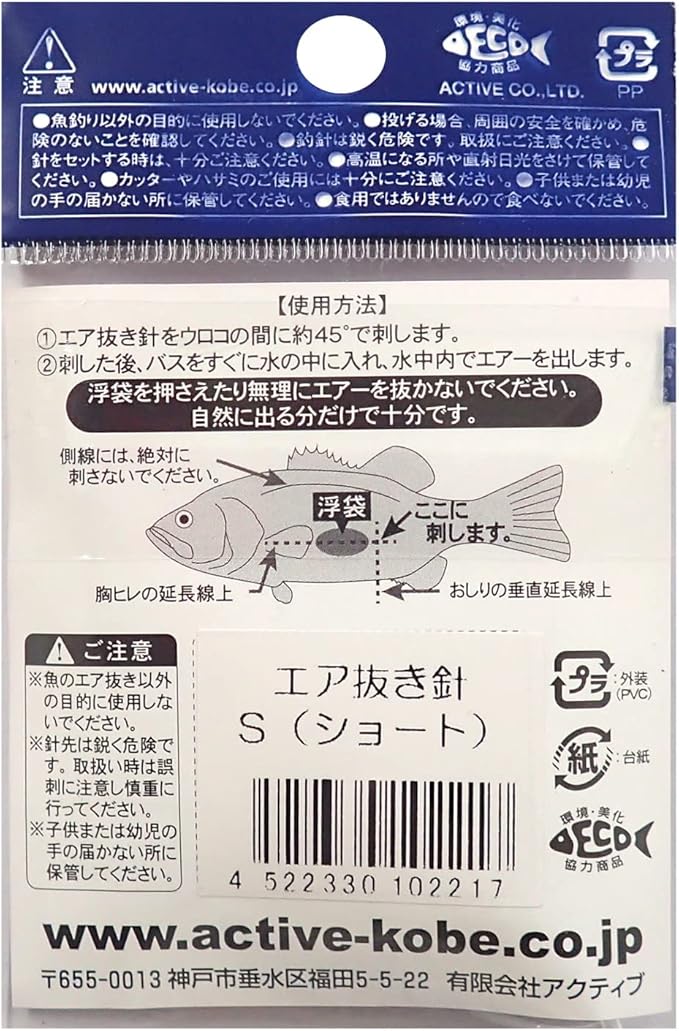 ACTIVE/アクティブエアー抜き針◆1本入りディープレンジでキャッチしたバスを、安心してウエイイン する為の専用エア抜き針です。 ●使用方法 1.エア抜き針をウロコの間に約45゜に刺します。 2.水中でエアを放出して下さい。 3.無理にエアを出さず、自然に抜けた量でOK.です。
