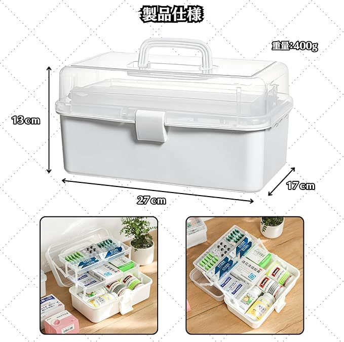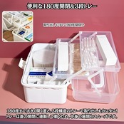 【便利な180度開閉&3段トレー】180度まで大きく開く蓋と、3段構造のトレーで収納アイテム全体に簡単にアクセス可能!トレーは蓋の開閉に連動して動くため、中身の取り出しもスムーズです。家庭用の救急箱や薬ケースとしても使いやすいデザインです。