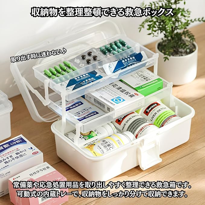 【一目でわかる透明収納】常備薬や応急処置用品をスッキリ整理し、必要なものを素早く取り出せる救急箱です。可動式のトレーが内蔵されており、綿棒や感冒薬をしっかり分けて収納できます。蓋は透明タイプで中身の確認もしやすく、閉じる際はバックルでしっかりとロックできます。防塵・防臭効果も期待できる収納の強い味方です。