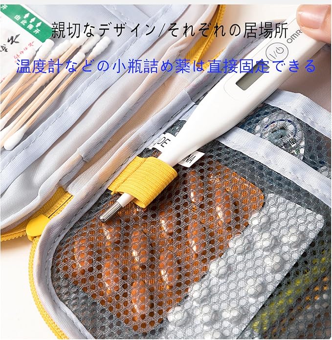 【複数の構造】内部にはメッシュポケットとフォルダーがあり、救急用品をきちんと整理できます。 緊急時の空袋には、薬を整理するための透明なコンパートメントと、迅速な保管のための緊急ギアがあります。