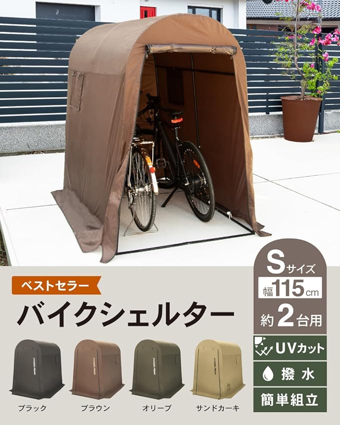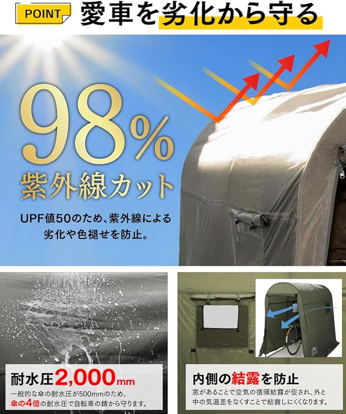 【大切なバイクや自転車を守るリーズナブルなシェルター】 PYKES PEAK( パイクスピーク )より、あなたの大切なバイクや自転車を雨風、日差し、埃から守り、快適な収納を実現します。幕の生地には、高機能ポリエステル生地を採用しています。 本体生地には、キャンプテントなどにも使用される抜群の撥水性と耐久性を兼ね備えた高機能ポリエステル生地を採用しています。シート裏面にPUコーティング加工された高耐水加工生地は、最大2,000mmの耐水圧を誇ります。シートの縫い目部にはシームテープ加工を施し、雨や水滴の侵入を軽減します。さらに、UV加工が施された生地は、UPF値50の高いUV防止効果を発揮し、大切な愛車を雨や湿気、太陽光からの紫外線などから保護し、愛車の劣化や色あせを最小限に抑えます。