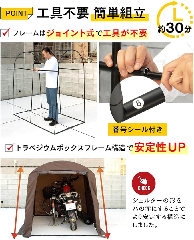 【工具不要の簡単組立て】 当バイクシェルターの組み立てには工具は不要で、フレームは差し込むだけの簡単設計です。フレームには組み立ての順番を示す番号シールが取り付けられていますので、そのシールに従って簡単に組み立てることが出来ます。また日本語の取扱説明書も同梱されていますので、どなたでも簡単に組み立てが可能です。