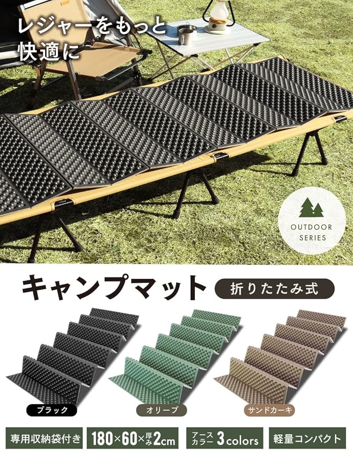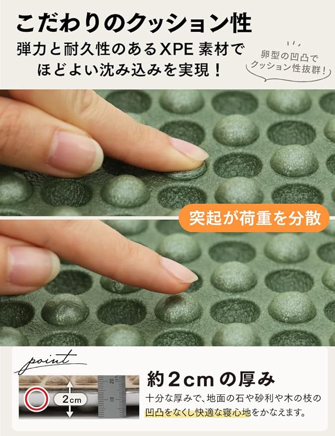✅【固すぎず柔らかすぎない“クッション性”】寝心地にこだわり、弾力と耐久性のあるXPE素材でほどよい沈み込みを実現。約20mmの厚みにより、地面の石や砂利や木の枝の凹凸をなくし快適な寝心地を叶えます。