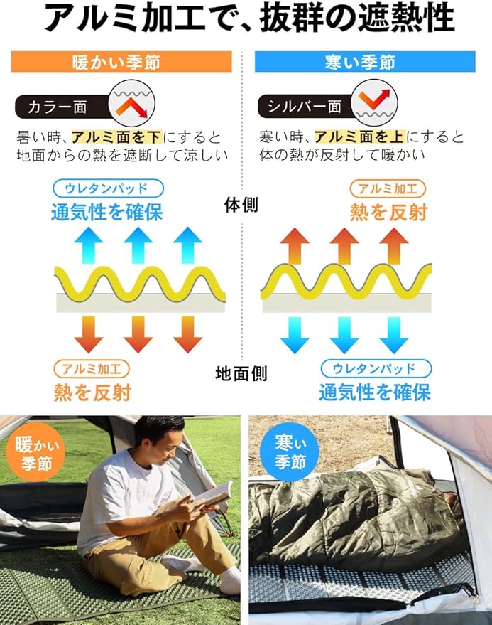 ✅【”アルミ加工”でオールシーズン快適な睡眠を】アルミ加工が施されている銀マットは夏と冬で使い分けることが可能!夏はアルミ面を下して地面からの熱を遮断し、冬はアルミ面を上にして自身の体温を反射して温かさを保つことができます。