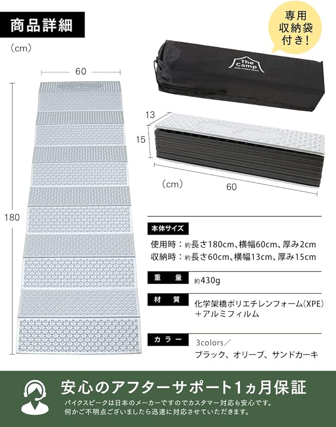 ✅【仕様 / セット内容 /HOT保証】【仕様】本体サイズ:(約)幅60cm 長さ180cm 厚さ2cm(使用時)、幅15cm 長さ60cm 厚さ13cm(収納時)、重量:約430g、材質:XPE(化学架橋ポリエチレンフォーム)+アルミフィルム【セット内容】本体 1、収納袋 1【HOT保証】PYKES PEAKは日本のHOTです。カスタマー対応も日本人スタッフが日本語で丁寧に対応いたします。初期不良や故障などの場合は、ご気軽にご連絡ください。製品保証を含めご対応させて頂きます。