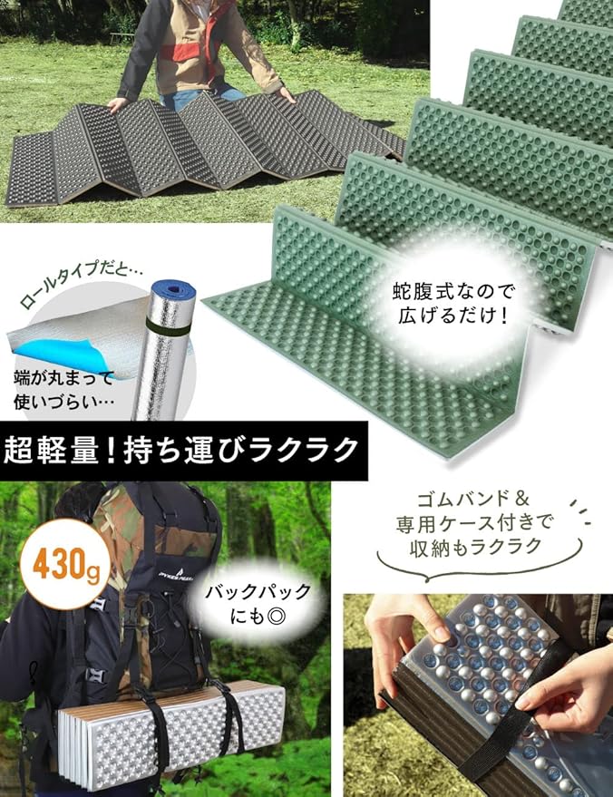 ✅【厚さ20mm折りたたみ式マット】パイクスピークのキャンプマットは、20mmと厚手なため硬い地面の凹凸を直に感じずに快適に眠ることができます。また、片面はアルミ加工になっているため夏場は地面に溜まった熱を防ぎ、冬場は地面からくる冷えを和らげます。