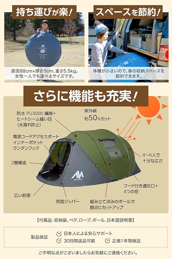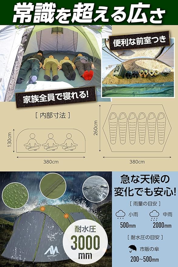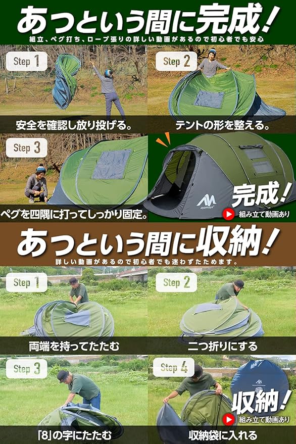 ✅【 投げるだけ で 組み立て可能 】 ▶︎組み立て済みポールを使用しているので、テントを投げるだけで簡単組み立て ▶︎30秒で形が出来上がります。 ▶︎女性一人でも組み立て・撤収可能 ✅【 9ステップで撤収可能 】▶︎わずか9ステップで撤収可能 ▶︎撤収にかかる時間は2分半 わかりやすい “組み立て動画” と “撤収動画” があるから “初心者” でも安心 ✅【 圧倒的な広さ 】 ▶︎ポップアップテントの常識を超える広さ ▶︎家族全員が寝れる ▶︎縦260cm x 横380cm x 高さ130cm ▶︎最大6人収納、快適性を重視すると4人までが過ごしやすいです。 ✅【 便利な前室つき 】▶︎汚れた靴や荷物を置くのに便利 ▶︎前室のグランドシートは取り外し可能 ▶︎前室で簡単な調理もできます。 ☂️【 水の侵入を防ぐ 】▶︎最大耐水圧3,000mm ▶︎雨量の目安 小雨:500mm、中雨:2,000mm .