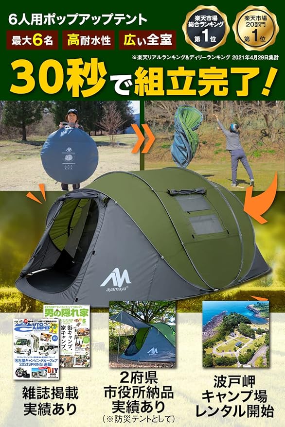 【初心者も組立1分 宿泊可 4人用ファミリーテント 】ayamaya ポップアップテント【テレビで4回紹介】4人~6人用 フルクローズ 防水 耐水圧3000mm 簡単組立 UVカット 防災 2層 アヤマヤ アウトドア キャンプ 前室付き ファミリー ワンタッチテント【 自信があるから、お試し返品可能 】