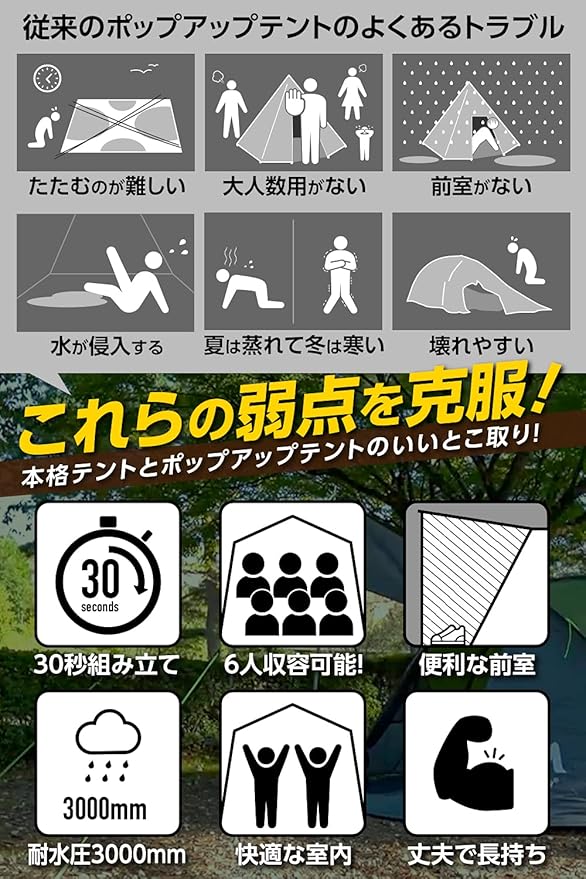 ✅【 30秒 で 本格テントの快適空間 を提供 】 ▶︎家族とキャンプをする時間を最大化するために、組み立てと片付けの時間を圧倒的に削減。 ▶︎30秒で組み立て出来るのに、本格テントの快適空間を提供します。 ✅【 従来品の問題点 を 克服 】 ▶︎従来ポップアップテントの6つの問題点 「畳むのが難しい」 「大人数用がない」 「前室がない」 「水が侵入する」 「夏は蒸れて、冬は寒い」 「壊れやすい」を “克服” しました。 ▶︎本格テントとポップアップテントのいいとこ取り .