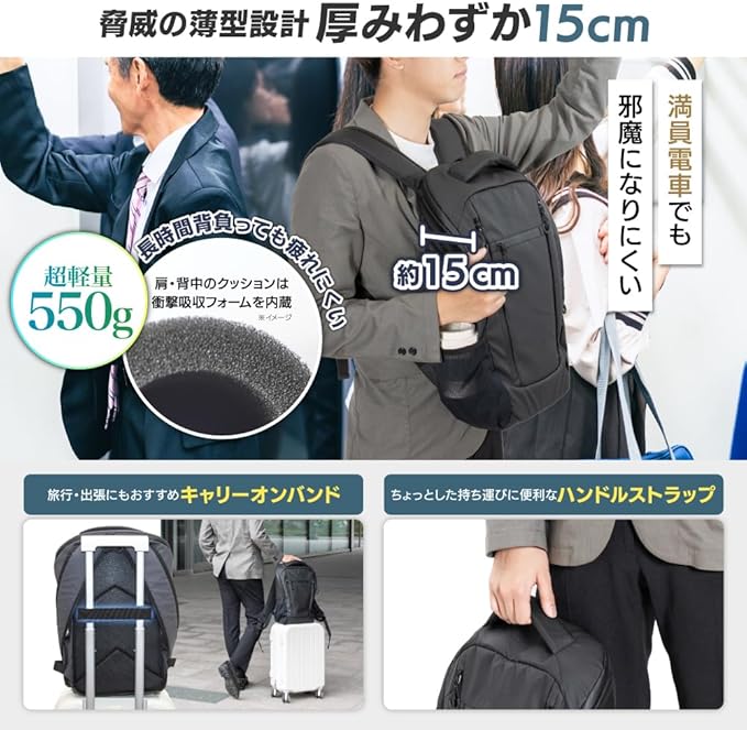 ✅【満員電車でもかさばらない、薄型軽量設計】本体重量はわずか約550gと、500mlペットボトル1本分ほど。軽量でありながら機能性をしっかり備えた設計で、長時間背負っても疲れにくく、毎日の通勤・通学に最適です。さらに、厚みを抑えたスリムなフォルムにより、混雑する電車やバスの中でも他人にぶつかりにくく、ストレスの少ない使用感を実現しています。背負ったまま移動する場面が多いユーザーにとって、体の動きに自然に馴染む快適性が魅力です。