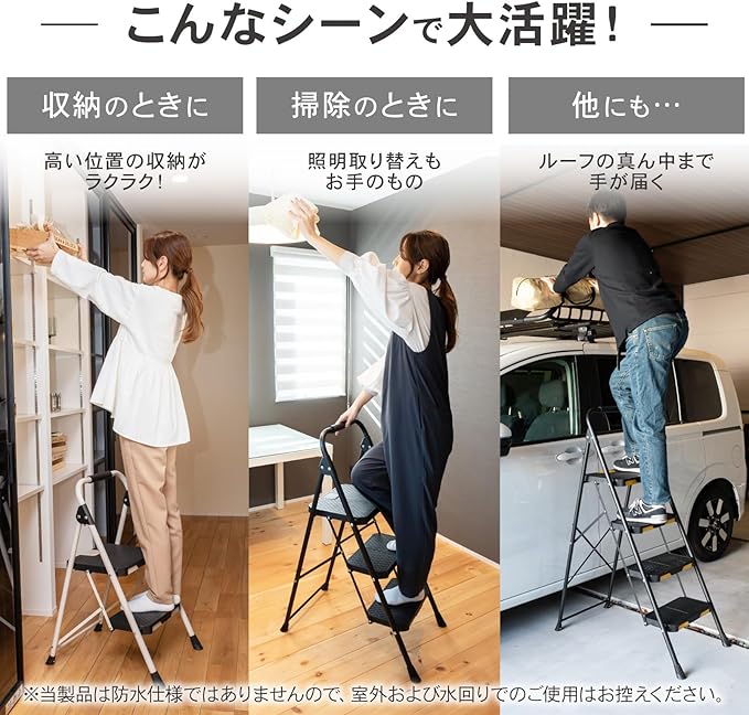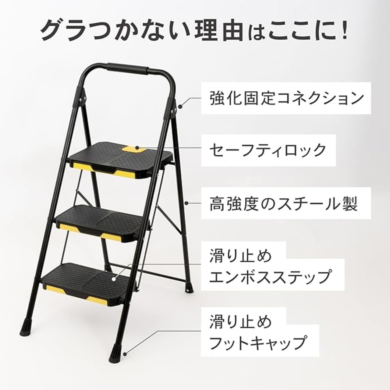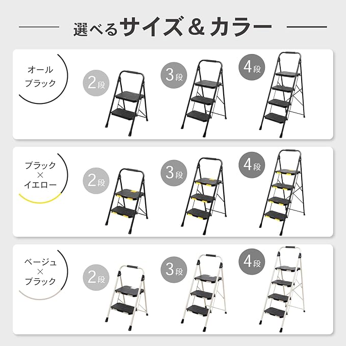 ✅【 どんなシーンでも活躍 】エアコン掃除や照明器具の交換、高所にある物を取る時に役立ちます。日常生活のちょっとした作業から、DIYや高所作業まで家庭やオフィスで様々な用途に、あらゆるシーンで活用できます。✅【 選べる3色 】オールブラック、ブラック イエロー、ベージュ ブラックのデザインで、ワンポイントツートンカラーのカラフルなステップで、おしゃれさと安全性を両立。
