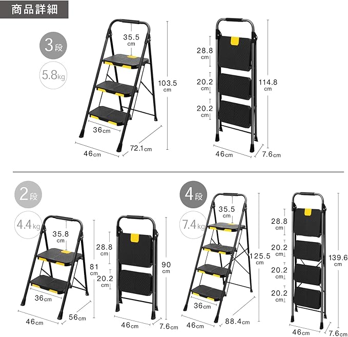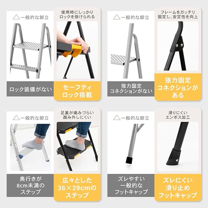 ✅【 高い 耐久性 】耐荷重150kgの高強度スチールフレームを採用し、長期間使用しても変形や劣化しにくい構造です。フレームの接合部分には強化コネクションを採用し、耐久性を一層強化。✅【 オリジナルのロック 】オリジナルロック機構がフレームをしっかり固定するため、ステップ(踏み台)が安定し、揺れを防ぎ、安定感のある使用ができます。