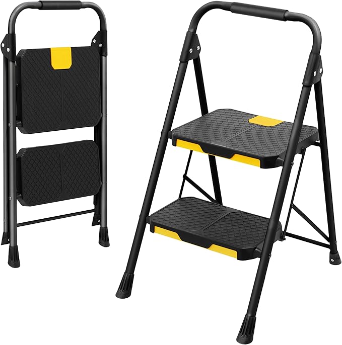 PYKES PEAK (パイクスピーク) 脚立 折りたたみ 2段 【 セーフティロック付き 組み立て不要 手すり 滑り止め スチール製 】耐荷重150kg コンパクト 持ち運び便利 室内 家庭用 踏み台 はしご おしゃれ (ブラック・イエロー)