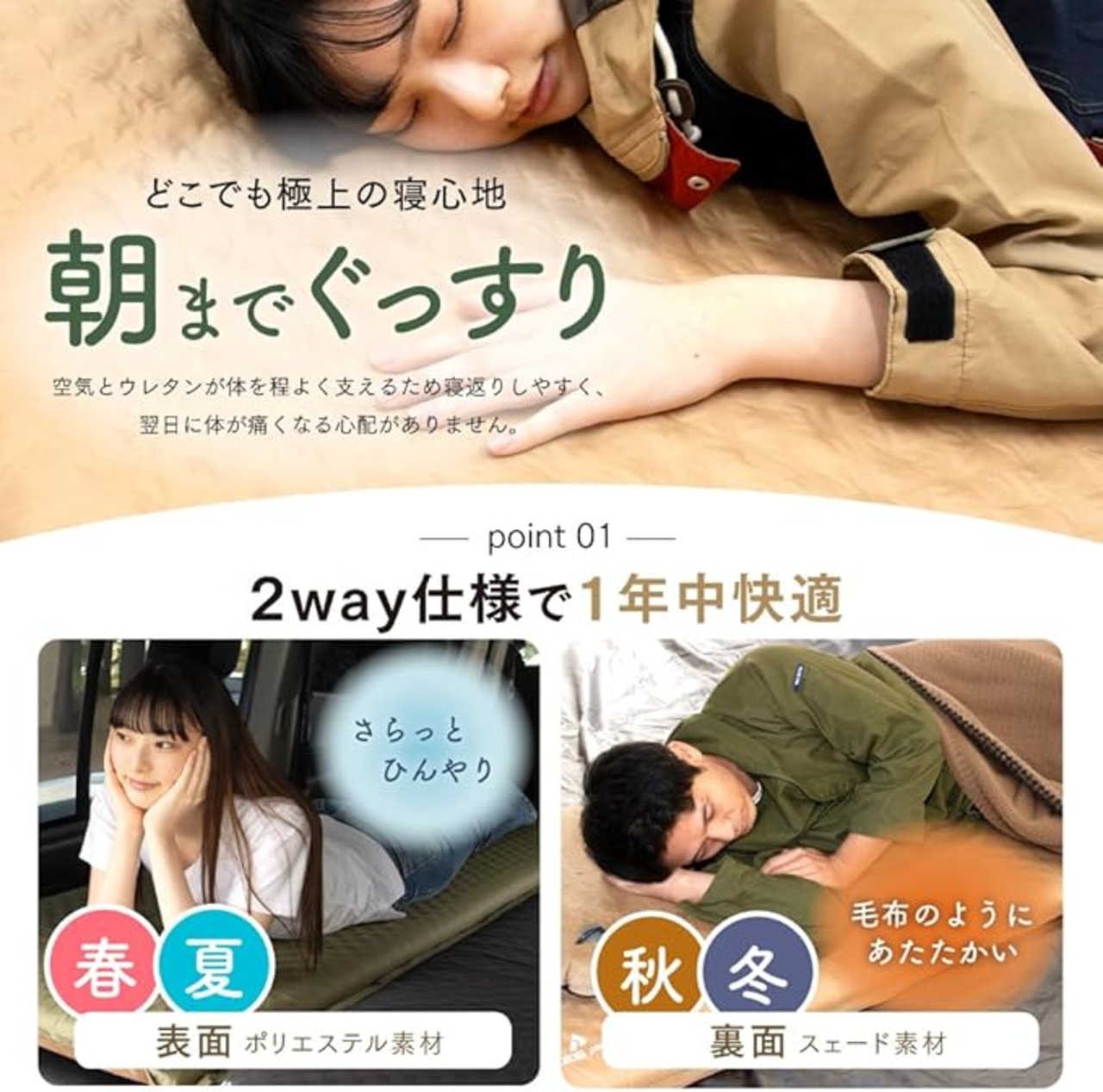 ✅【オールシーズン対応!】裏面「スエード素材」で冷気・熱を遮断。車中泊や冬キャンプで気になる地面からの冷気や熱を、8cmの断熱層と裏面の起毛スエード素材が効果的に遮断します。保温性も高いため、季節を問わず快適な睡眠をサポート。表面と裏面で異なる素材を採用し、いつでも心地よい肌触りを提供します。