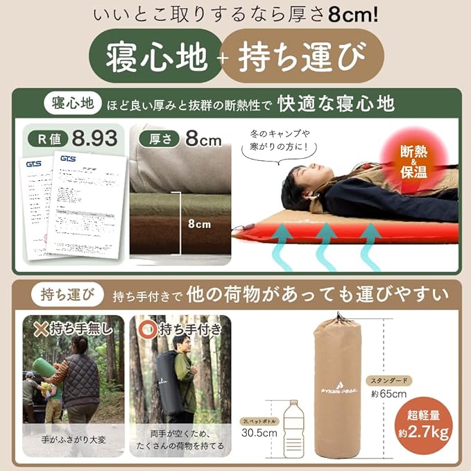 ✅【寝心地と携帯性を両立したこだわりのバランス】 インフレーターマットの厚みは、寝心地と持ち運びやすさの重要な要素です。地面のデコボコをしっかり吸収しつつ、収納しやすい「8cm」を採用。体圧分散に優れた凹凸ウレタンが体を点で支え、翌朝の体への負担を考えた快適な寝心地を提供します。