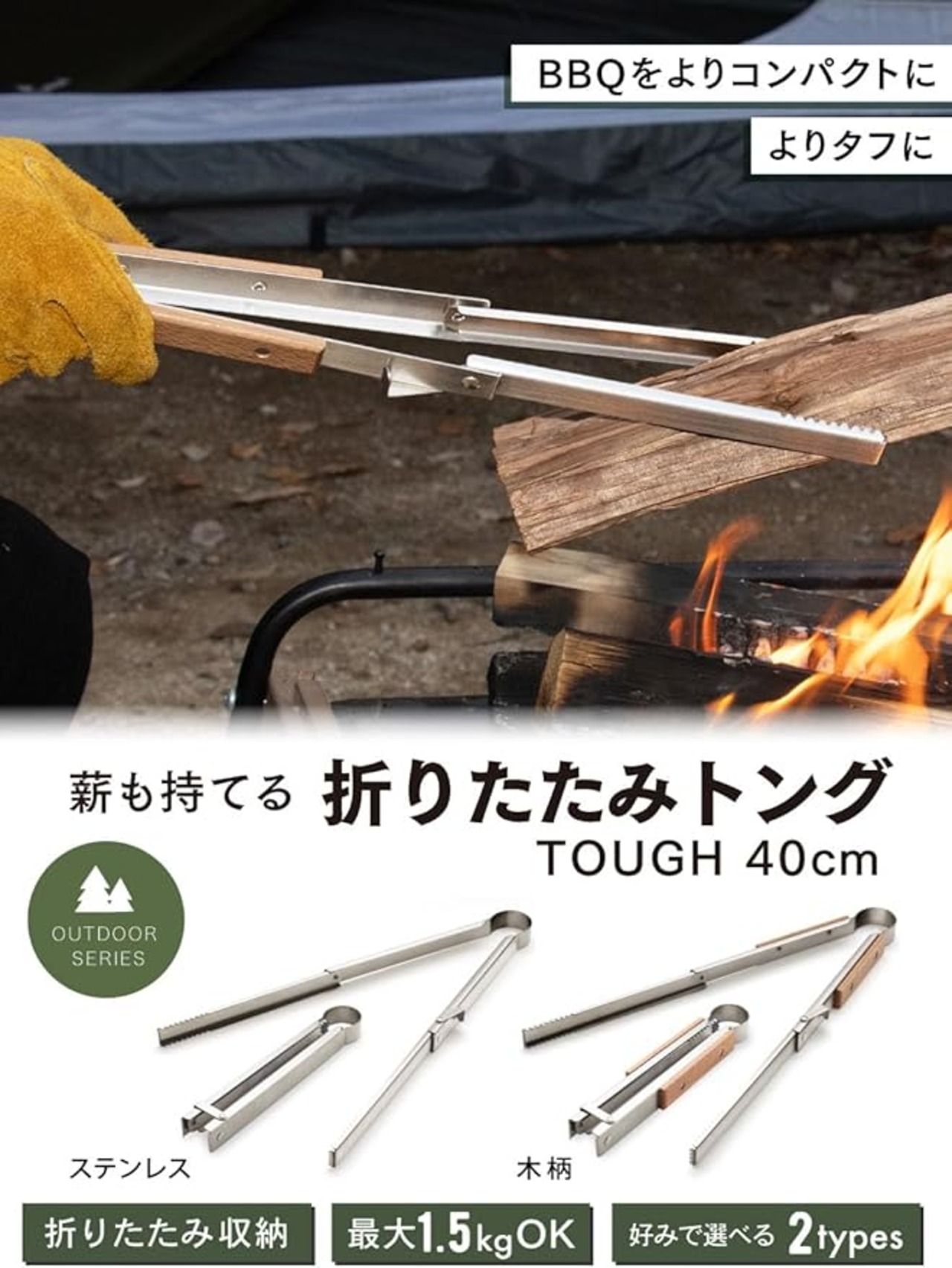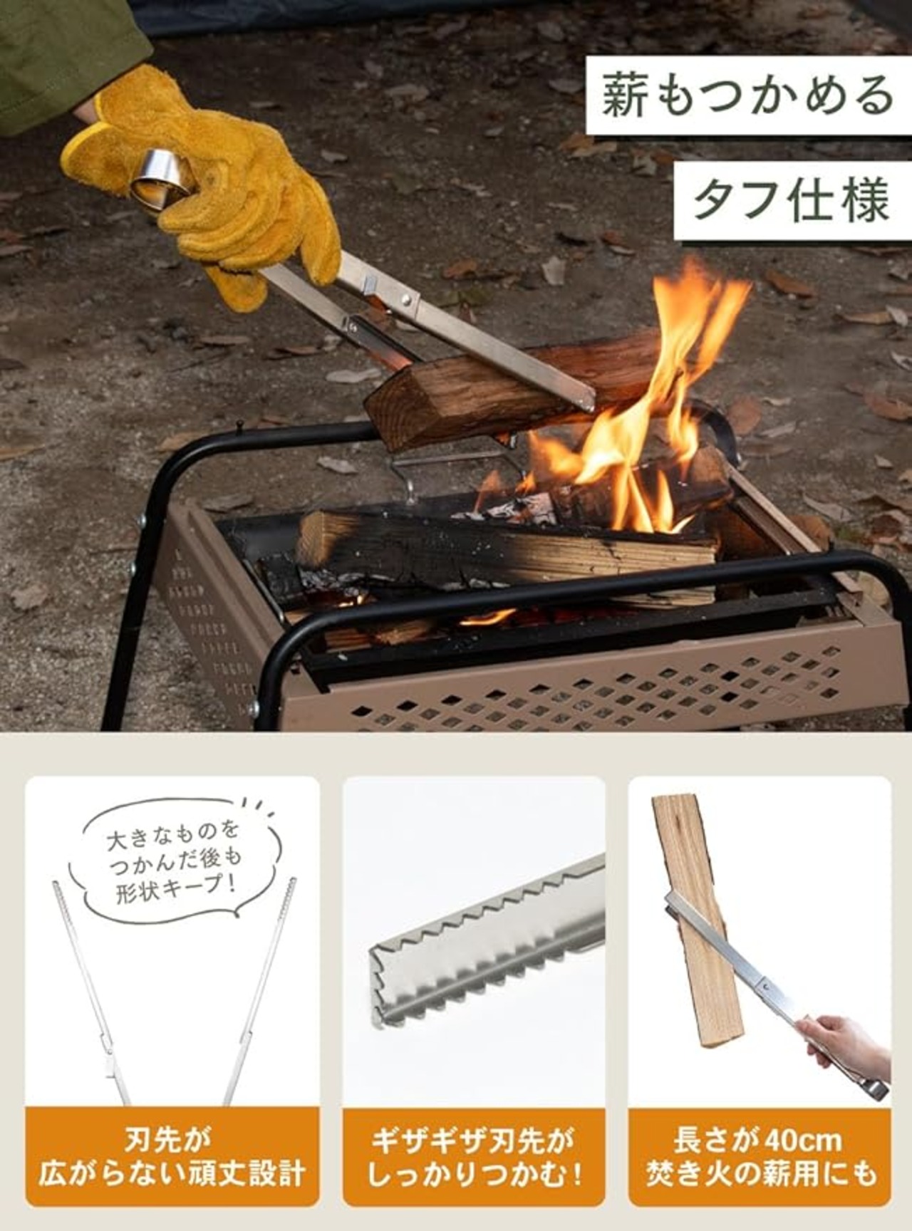 ・【薪も持てる!最大1.5kgまで】ギザギザ刃先で掴んだものを離さない。バーベキューの時の食材はもちろん、焚火時の薪もしっかりと掴めます。使用時の全長は40cmあるためコンパクトながらも使いやすいサイズ感になっております。