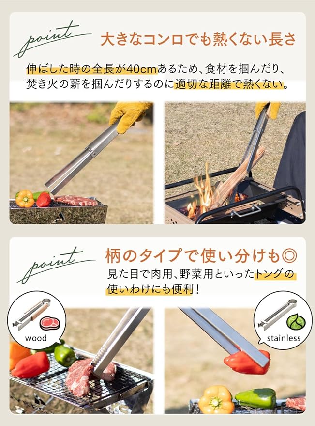 ・【刃先が広がらない / 木柄とステンレスで使い分けできる】折りたたみコンロを使う上で気になる刃先の広がりも改善しました。大きく重たい物を持った後でも刃先が元の状態に戻るため、何度でも繰り返し使うことができます。また、木柄とステンレスの2種類があるため、生肉用、野菜用など使い分けをすることができます。