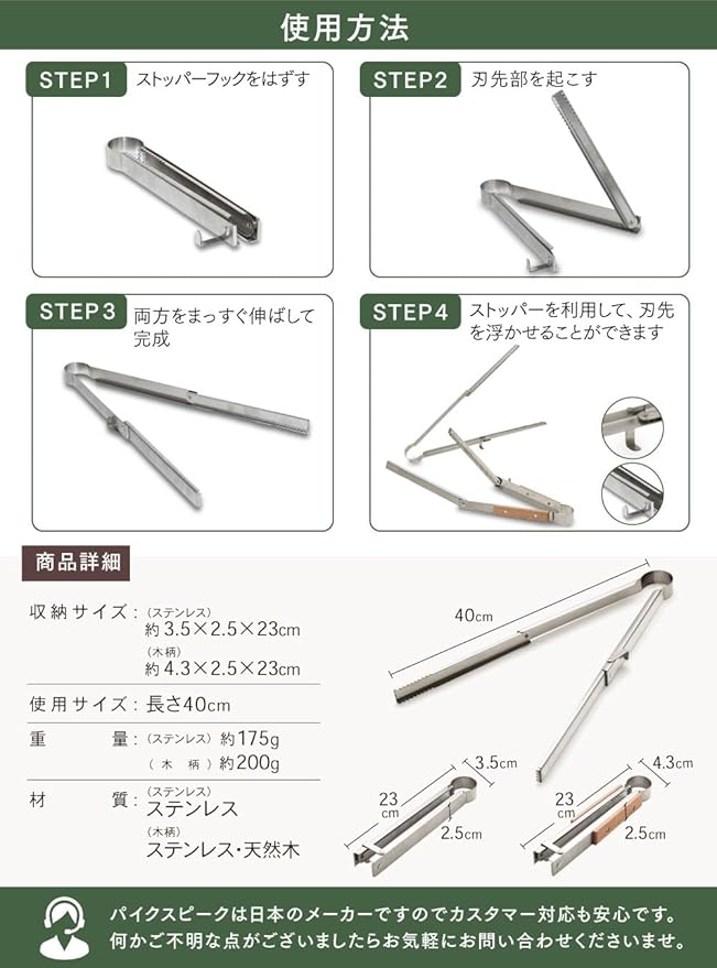 ・【製品仕様】使用サイズ(木柄):約40 x 3.5 x 2.5cm、使用サイズ(ステンレス):約40 x 4.3 x 2.5cm、収納サイズ(木柄):約23 x 4.3 x 2.5cm、収納サイズ(ステンレス):約23 x 3.5 x 2.5cm、本体重量:(木柄):約200g、(ステンレス):約175g、本体材質:(木柄):ステンレス201+木柄(雑木)、(ステンレス):ステンレス201、ワッシャー・ばねワッシャー・リベット:ステンレス201【HOT保証】PYKES PEAKは日本のHOTです。カスタマー対応も日本人スタッフが日本語で丁寧に対応いたします。初期不良や故障などの場合は、当社サポートまでご気軽にご連絡ください。製品保証を含めご対応させて頂きます。