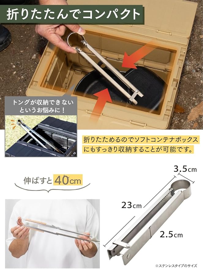 PYKES PEAK (パイクスピーク) トング 折りたたみ キャンプ コンパクト 火ばさみ 焚き火 バーベキュー ステンレス 焼肉 薪も持てる 全長40cm 収納時23cm TOUGH 40cm