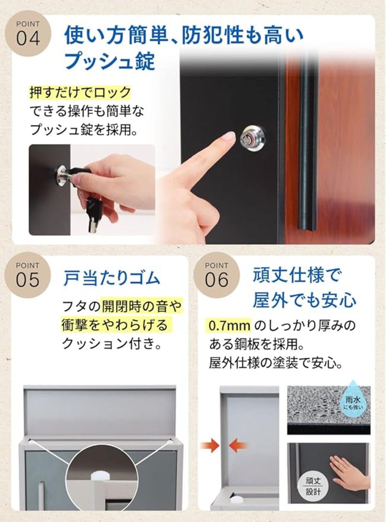 ✅【使い勝手便利な設計】シリンダープッシュ錠:押すだけでロック!操作簡単なプッシュ錠採用。マグネット付き扉:前扉にはマグネット付きで風などで扉がバタついたりしません。落下防止:前扉を大きく開けても郵便物が落下しにくい落下防止バー搭載。