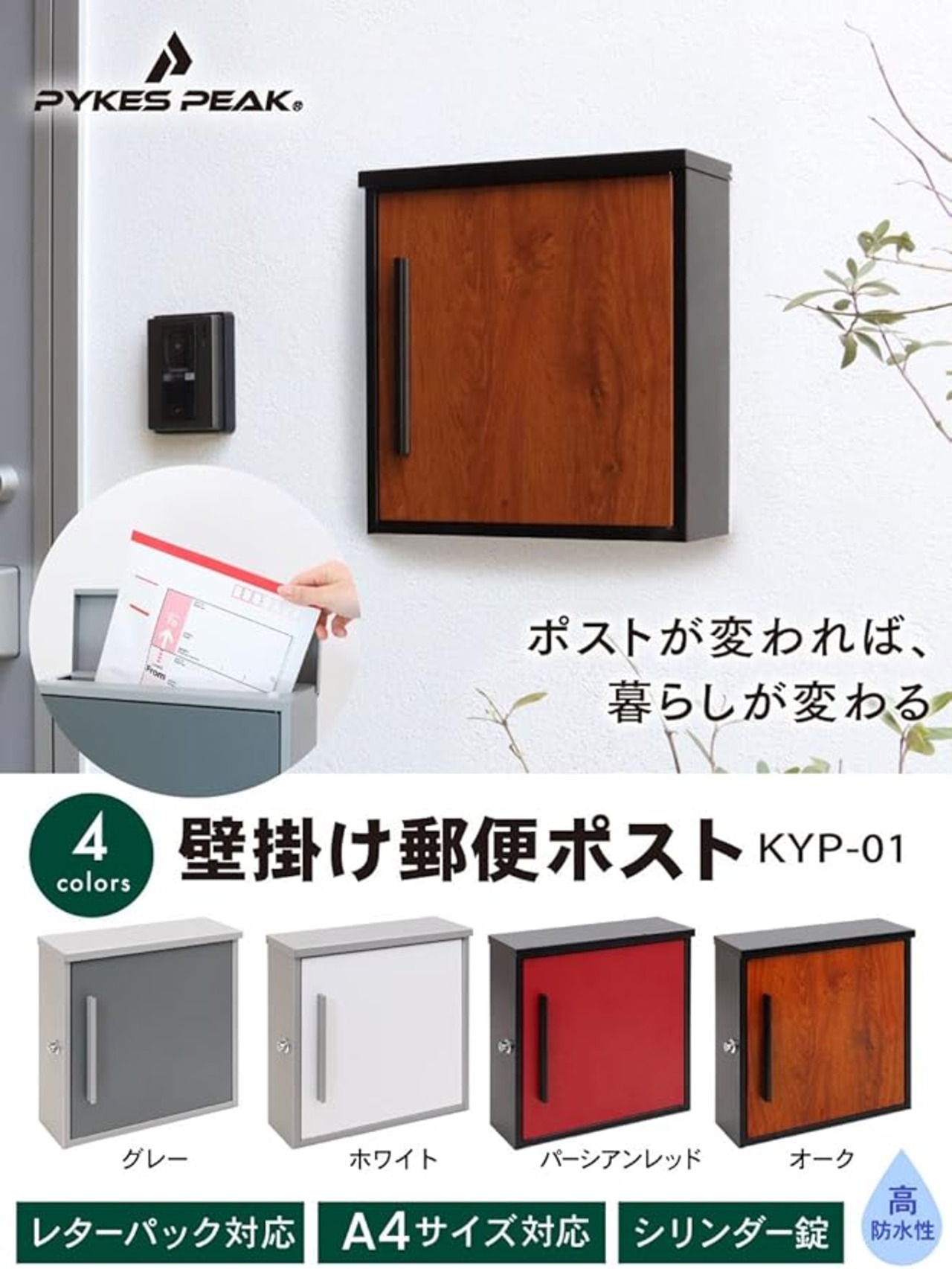 PYKES PEAK ポスト 壁掛け 郵便ポスト 郵便受け A4サイズ レターパック対応 おしゃれ ドア裏 大型 縦型 鍵付き KYP-01 (オーク)