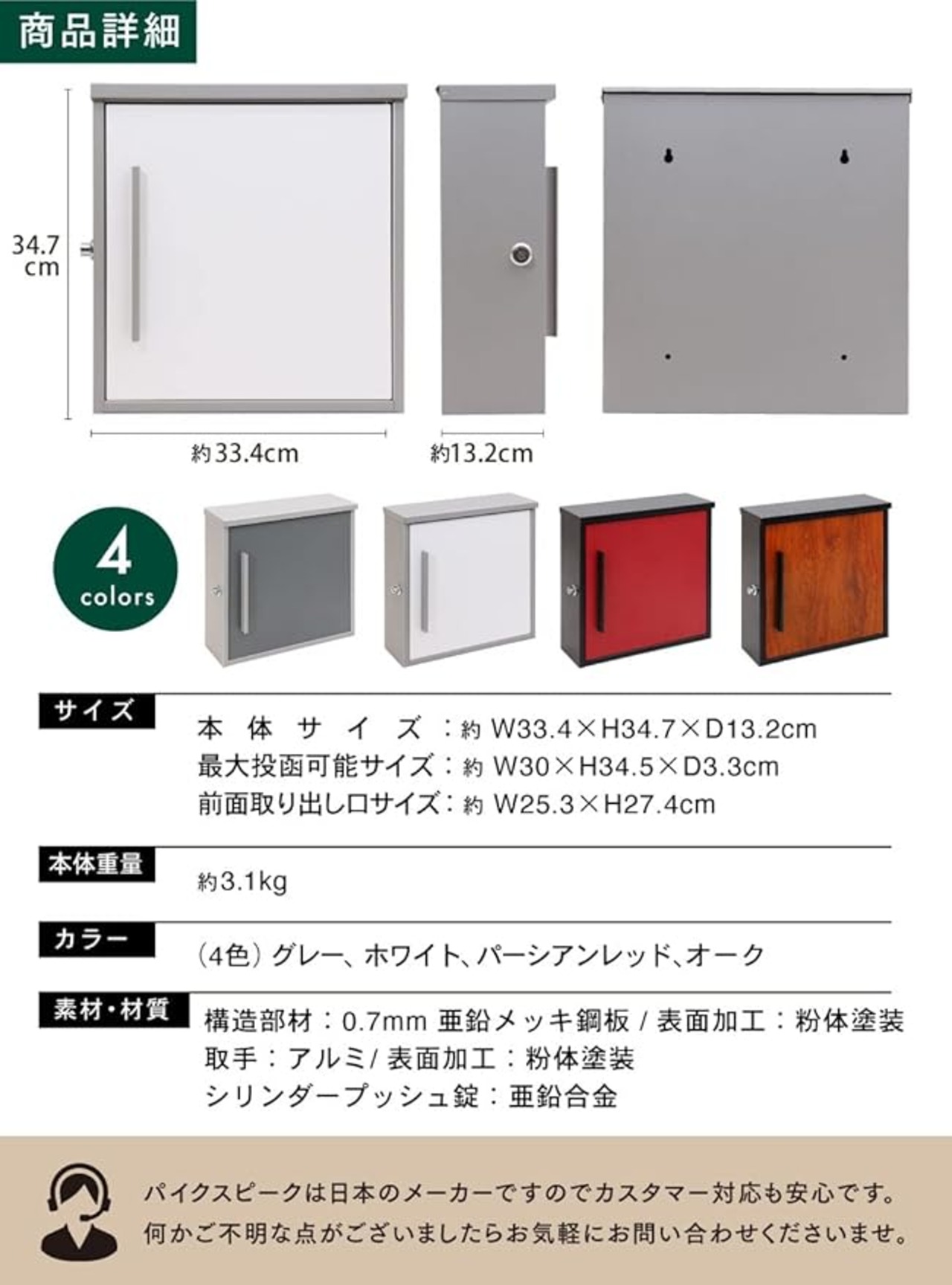 ✅【仕様 / セット内容 / HOT保証】【仕様】本体サイズ:約幅33.4cmx高さ34.7x奥行13.2cm、本体重量:約3.1kg、最大投函サイズ:約幅30x高さ34.5x厚み3.3cm、前面取り出し口サイズ:約幅25.3x高さ27.4cm、素材・材質:構造部材:0.7mm 亜鉛メッキ鋼板 / 表面加工:粉体塗装、取手:アルミ / 表面加工:粉体塗装、シンダープッシュ錠:亜鉛合金【セット内容】本体x1、カールプラグx1、ネジx4、スペーサー 4、鍵x2、取扱説明書x1【HOT保証】PYKES PEAKは日本のHOTです。カスタマー対応も日本人スタッフが日本語で丁寧に対応いたします。初期不良や故障などの場合は、当社サポートまでご気軽にご連絡ください。製品保証を含めご対応させて頂きます。